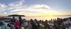 当日は快晴、この時期にしては暖かく、周辺の駐車場は屋台もたくさん出て大変な賑わいでした。早めに着いたのでベストポジションの砂浜を確保して、屋台で買った焼きそばとビールを日が沈みゆく美しい湘南の海を眺めながら楽しみました。