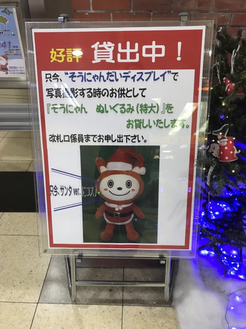 V0l.29 クリスマスのそうにゃんだい(2016.12神奈川県藤沢市) 2017年1月1日 オフ 投稿者: Jack_Amahno 湘南台のそうにゃん、クリスマスのディスプレイです。 今回は記念撮影用のぬいぐるみの貸し出しも。。相鉄なかなかやりますね。クリスマスの日ちっちゃい子が嬉しそうにぬいぐるみを抱いて記念撮影してました。 関連記事 V0l.28 そうにゃんだいっ!(2016.10神奈川県藤沢市) ここは、相模鉄道の湘南台駅、改札を入って…... V0l.26 濃溝の滝(2016.07千葉県君津市) 夏頃に話題になった千葉県にあるジブリの一…... 池田丸 稲村ヶ崎店 都電荒川線